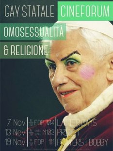 17.11.2013 - Um panfleto publicitário de um festival cinematográfico sobre homossexualidade e religião organizado por estudantes na Universidade de Milão, utilizando uma imagem retocada do papa emérito Bento XVI com maquiagem, gerou várias críticas na Itália.