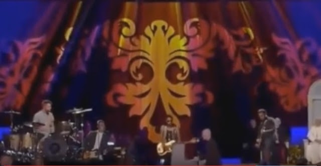 De repente aparece essa imagem no fundo, que sem dúvida aparenta uma figura no minimo muito estranha para um evento católico. Eu até me recuso a dizer o que parece de fato ser.