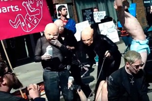 De repente, aproximadamente dez membros do Templo Satânico se aproximaram do lugar e iniciaram uma estranha representação na qual a maioria colocou uma máscara de bebê, onde um batia no outro com chicotes e colocavam talco e tomavam leite em garrafas ou mamadeiras grandes.