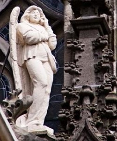 Abaixo um exemplo destas restaurações modernas: Na Catedral de São João Evangelista, em Hertogenbosch (Países Baixos) - Anjo com com celular e vestindo calça jeans.