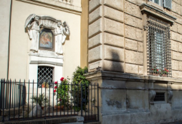 A imagem é um afresco da escola do século XIX e representa a Virgem Maria com o Menino Jesus, venerada como Nossa Senhora das Graças e, depois desse episódio, conhecida popularmente também como “Nossa Senhora das Bombas”. A imagem fica entre o Palácio do Santo Ofício e a entrada do Pontifício Oratório de São Pedro, num trecho de muro rodeado por um pequeno jardim.