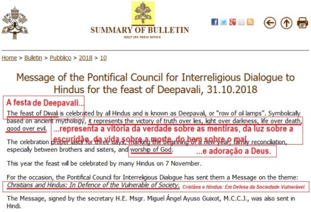 Com o mesmo carisma "ecumaníaco" da peregrinação de Ceuta, agora, por ocasião da celebração de mais um Deepavali, o Vaticano une-se espiritualmente à alegria dos irmãos hindus pelo triunfo do "deus" (estranho) Rama sobre o demónio Ravana.